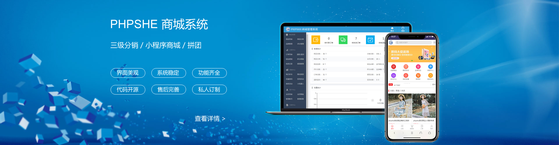 PHPSHE電商系統(tǒng)基于自家內(nèi)核框架開(kāi)發(fā),移動(dòng)端使用現(xiàn)下流行的多端框架UNI-APP打造,